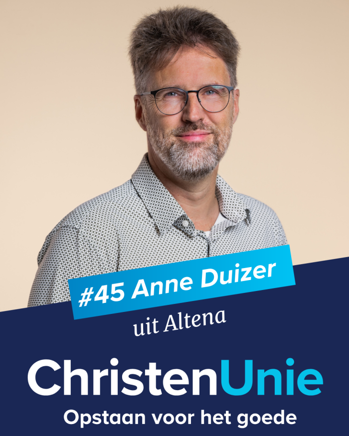 Als Christenunie zien wij een gemeentelijke organisatie voor ons die dienstbaar is aan de groei en bloei van de inwoners van Altena. Onze gemeente kan alleen floreren als we als overheid dienstbaar zijn aan onze inwoners en zo veel mogelijk samen optrekken. Wij willen een gemeente zijn waarin burgers vertrouwen hebben in de overheid, waarin ze gehoord en serieus genomen worden, en waarin er ruimte is voor participatie en dialoog. Wij hopen dan ook dat als dit gemeentehuis wordt verbouwd het straks nog opener en toegankelijker wordt voor onze burgers en dat onze ambtenaren dagelijks in de kernen en bij onze maatschappelijke partners te vinden zijn.